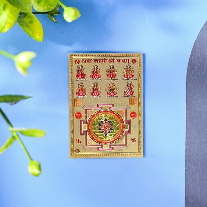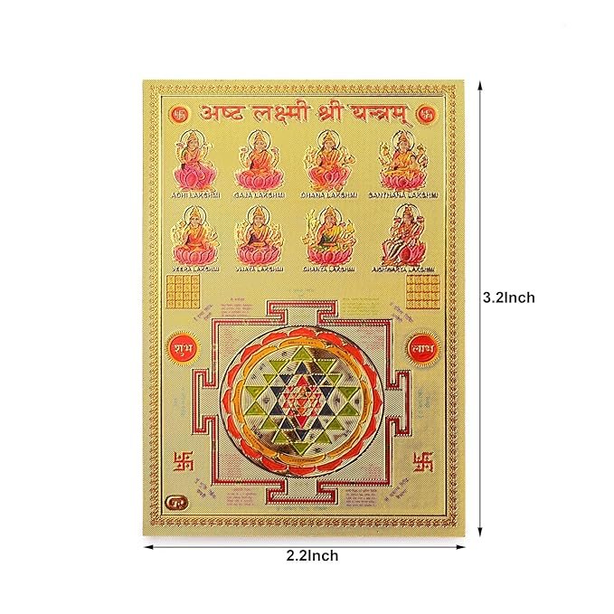 DHRUVS COLLECTION ASHT Lakshmi Shree Yantra Self Adhesive Small Pocket Size Gold Plated Yantra Sticker for Worship, Bike, Car, Home, Office, Pooja Ghar & Temple Use (2.2 x 3.2 Inches)
