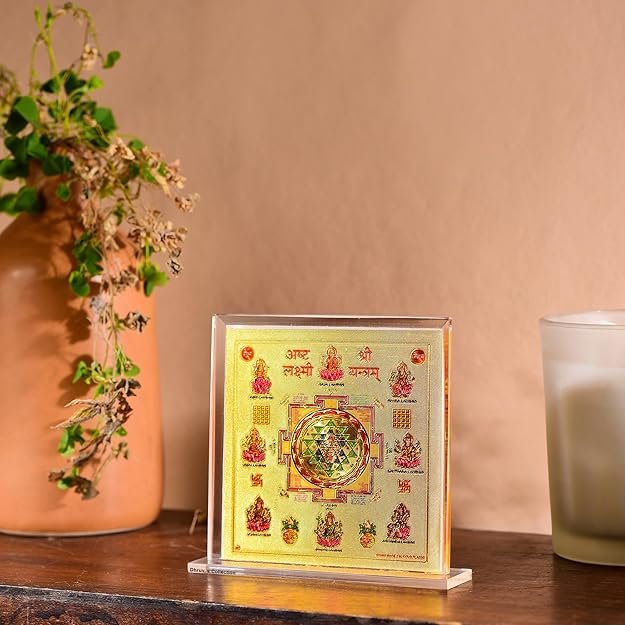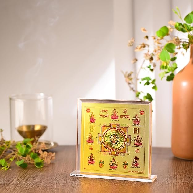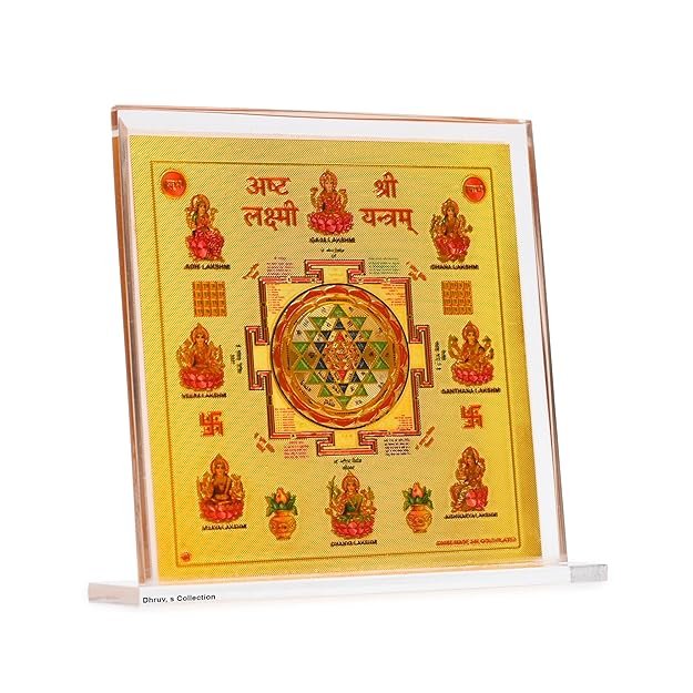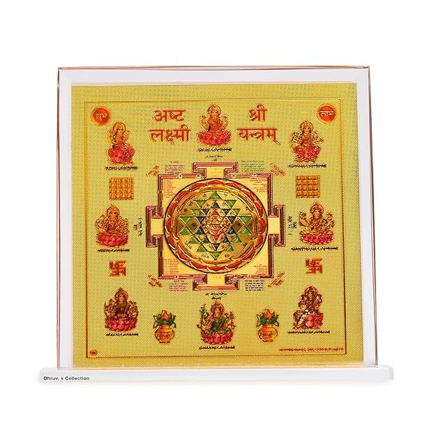 DHRUVS COLLECTION Gold Plated Asht Lakshmi Yantra for Home, Office, Business Place, Pooja Worship, Gifting & Donation – Spiritual Healing, Rectangle Shape, Metal Made With Base & Frame, Size 4.5 x 4 Inch