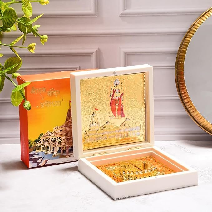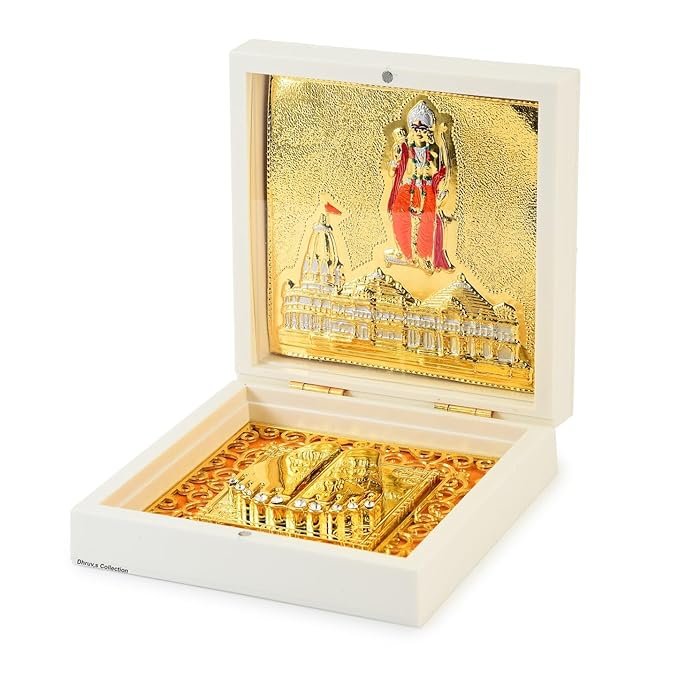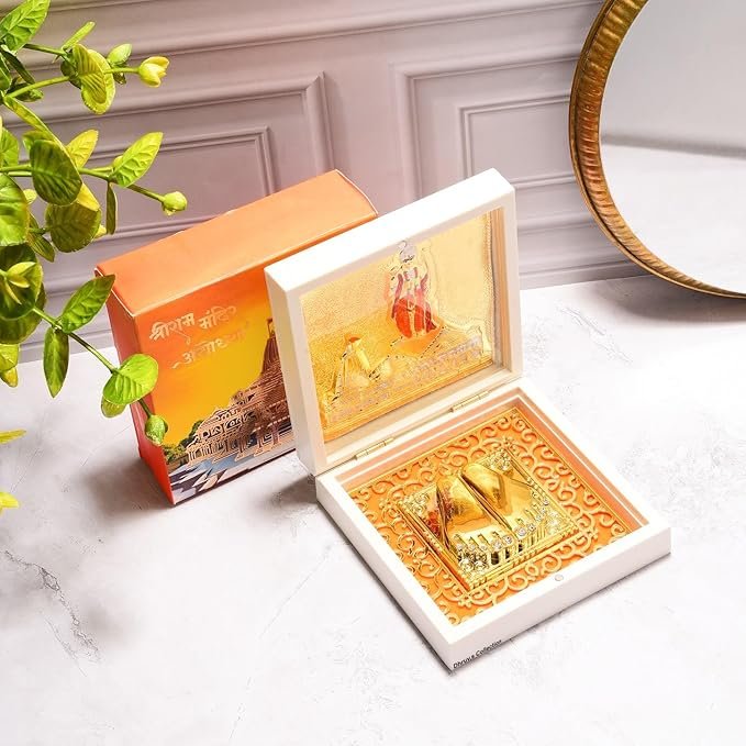 - SPIRITUAL DECOR: Gold plated 3D replica of the sacred Ayodhya Ram Mandir with Ram Charan Paduka, perfect for enhancing the divine ambience of your home mandir, pooja room or office space