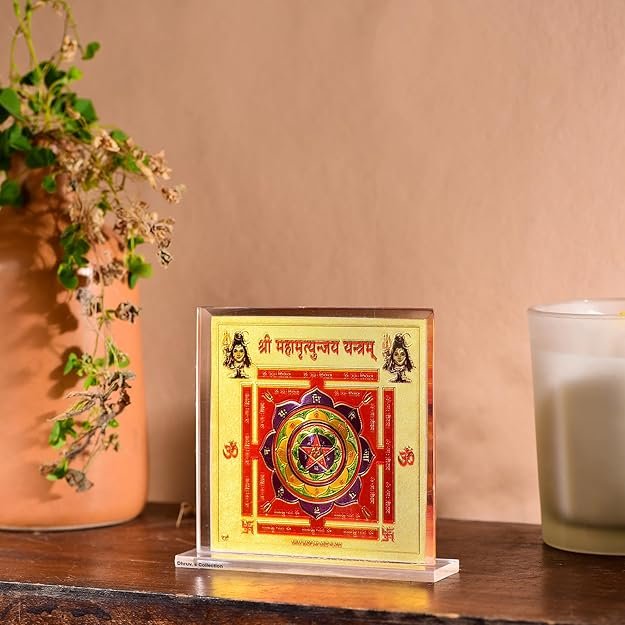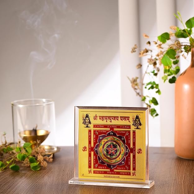 DHRUVS COLLECTION Gold Plated Mahamrityunjaya Yantra for Home, Office, Business Place, Pooja Worship, Gifting & Donation – Spiritual Healing, Rectangle Shape, Metal Made With Base & Frame, Size 4.5 x 4 Inch