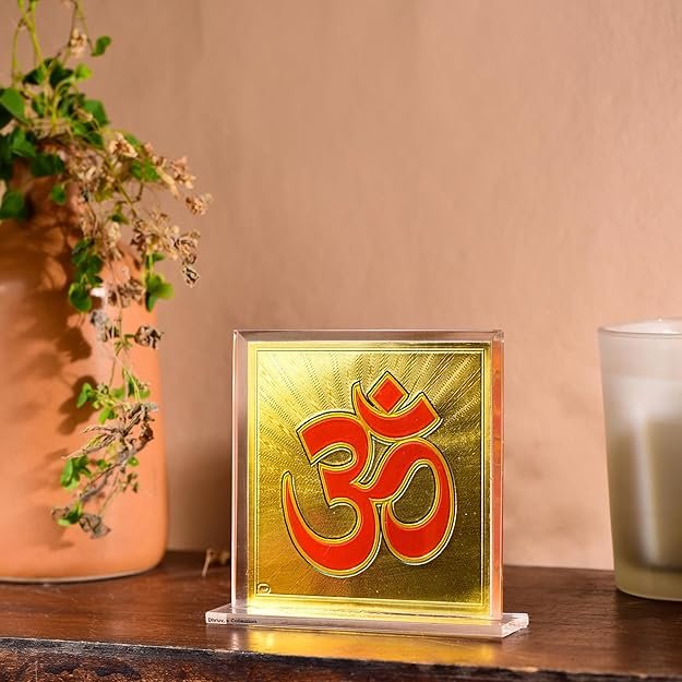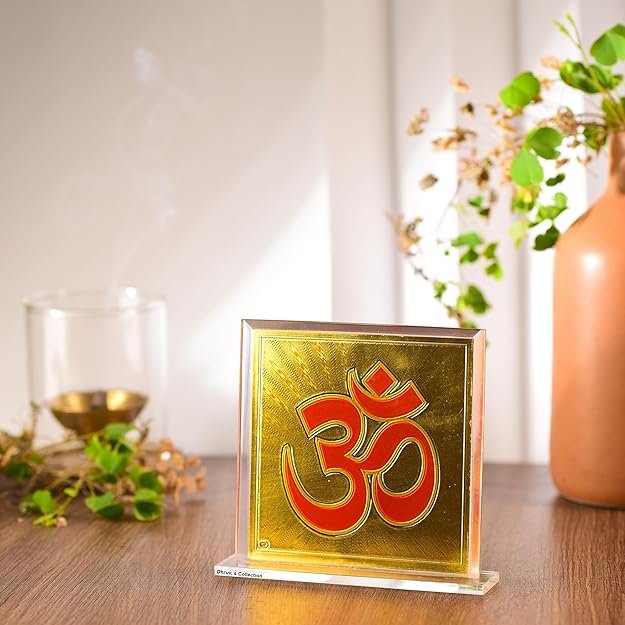 DHRUVS COLLECTION Gold Plated OM Yantra for Home, Office, Business Place, Pooja Worship, Gifting & Donation – Spiritual Healing, Rectangle Shape, Metal Made With Base & Frame, Size 4.5 x 4 Inch