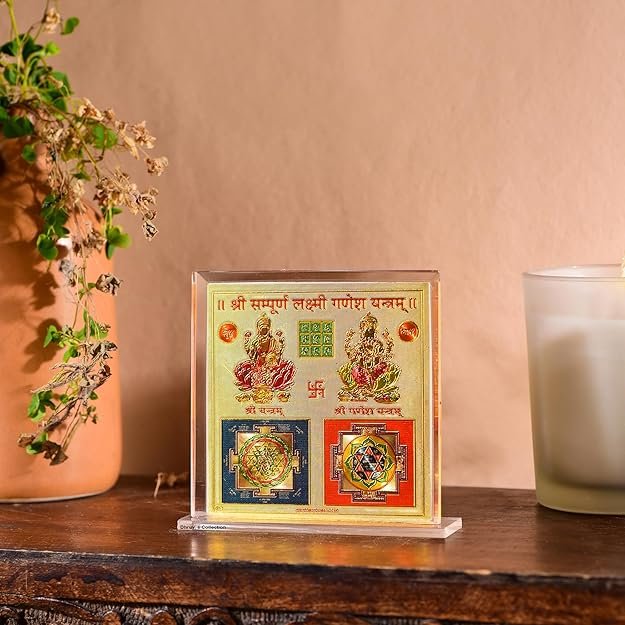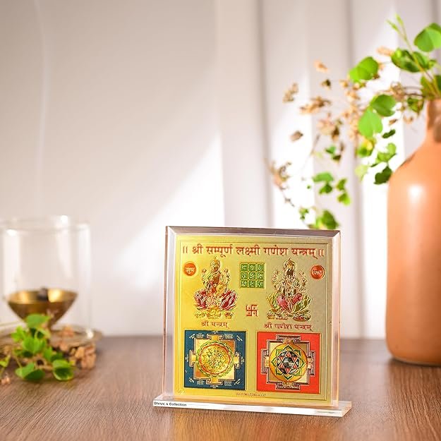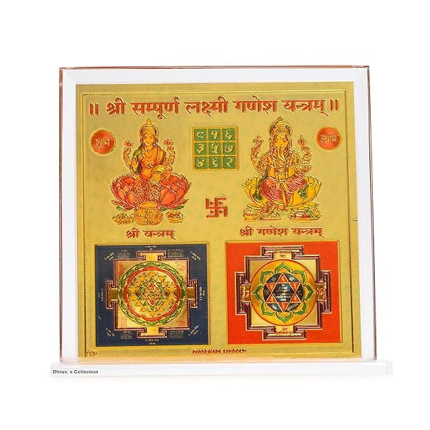 DHRUVS COLLECTION Gold Plated Sampurn Lakshmi Ganesh Yantra for Home, Office, Business Place, Pooja Worship, Gifting & Donation – Spiritual Healing, Rectangle Shape, Metal Made With Base & Frame, Size 4.5 x 4 Inch
