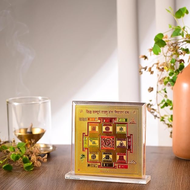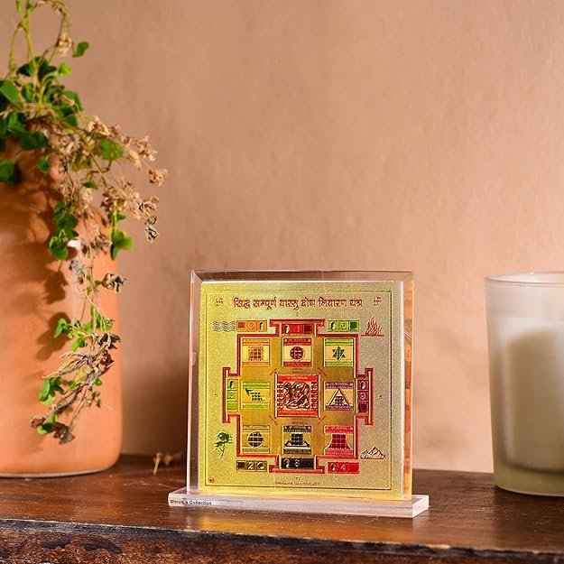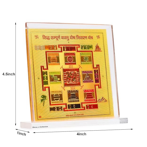 DHRUVS COLLECTION Gold Plated Vastu Dosh Nivarak Yantra for Home, Office, Business Place, Pooja Worship, Gifting & Donation – Spiritual Healing, Rectangle Shape, Metal Made With Base & Frame, Size 4.5 x 4 Inch