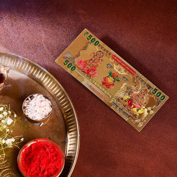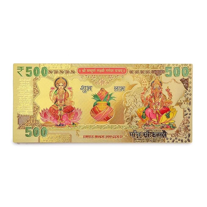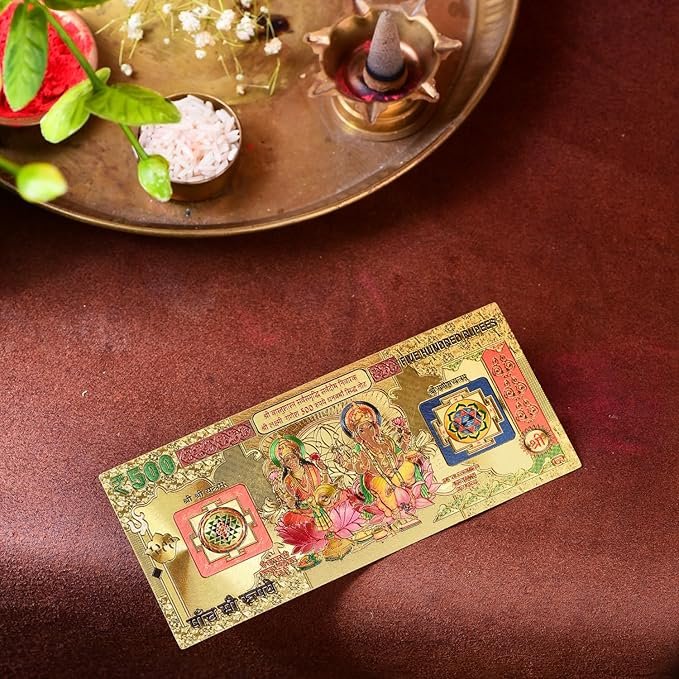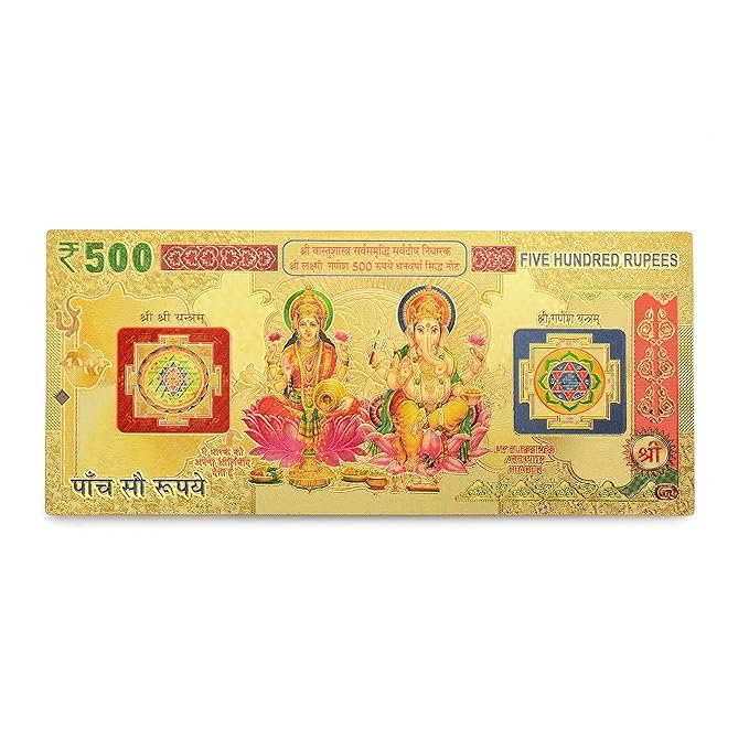 DHRUVS COLLECTION Small Pocket Size Gold Plated Shree Sampurna Lakshmi Ganesh Yantra 500 Rupee Note | Auspicious Religious Showpiece for Worship, Home, Office, Pooja Ghar & Temple Use